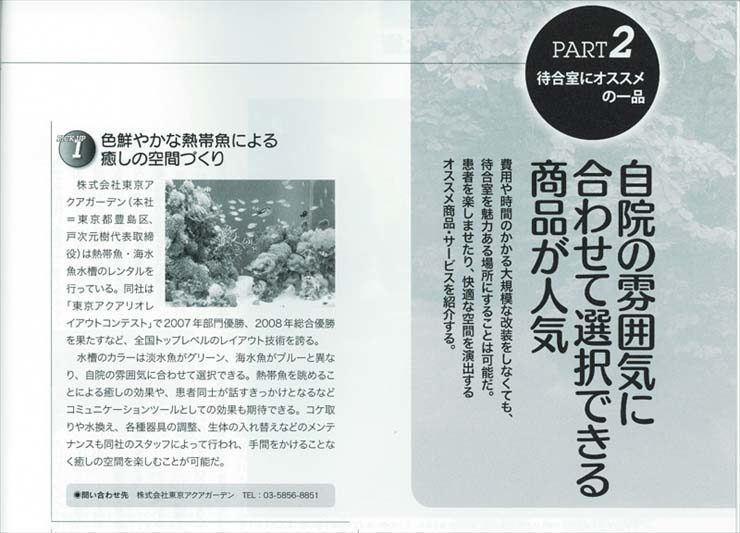 開業医向けの医療情報雑誌にて、病院やクリニックの待合室にオススメのものとして東京アクアガーデンの水槽レンタルサービスが紹介されました。